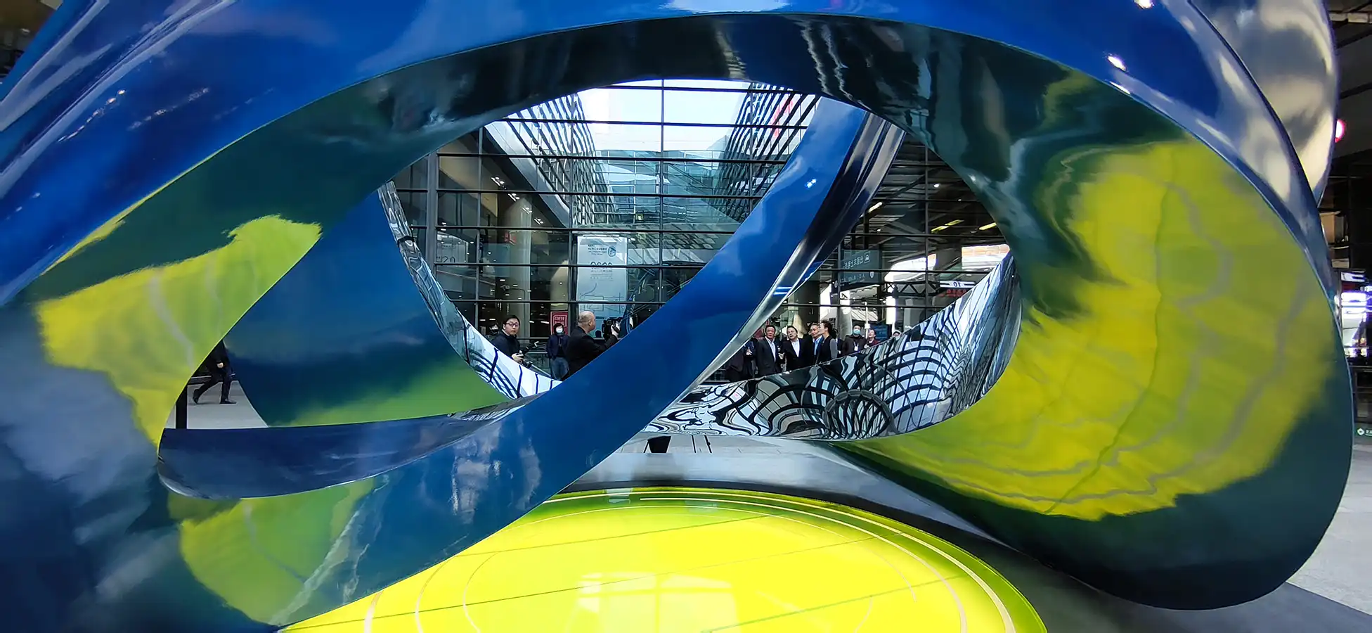 机场是不同空间、时间的交汇编织起梦想的纽带,它连接世界,连接你我。作品结合上海机场集团LOGO的理念,运用行云流水的线条构建了一个时空隧道。