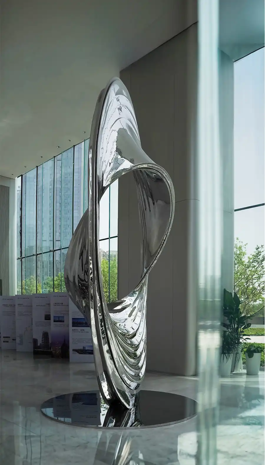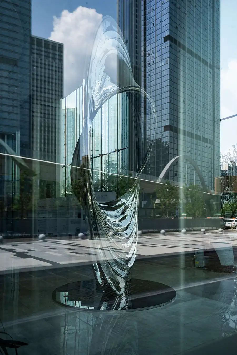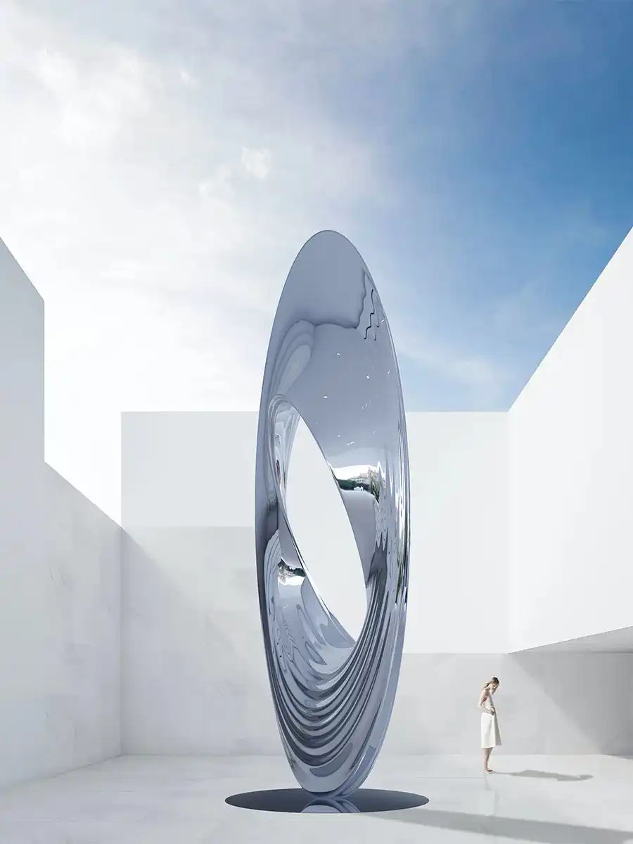 灵感源自宇宙黑洞的引力与神秘,作品凝练成“未来之眼”的视觉符号。它以当代抽象艺术语汇,构筑一座贯通当下与未知的视觉桥梁。 选用镜面不锈钢,其表面纯净如宇宙幕布,却暗藏玄机——将流转的时空与周遭万象,悉数折叠、吸纳于曲面之中。这不仅是反射,更是创造了一个超维镜像空间,让数字洪流与物质实体在此交融共生,预演着未来艺术的形态。 作品整体构成一个充满动势的无限循环体。这不仅是视觉的闭环,更是象征金茂大厦如宇宙能量般永续运行、生生不息的核心场域,昭示其不断开启未来新章的美好愿景。