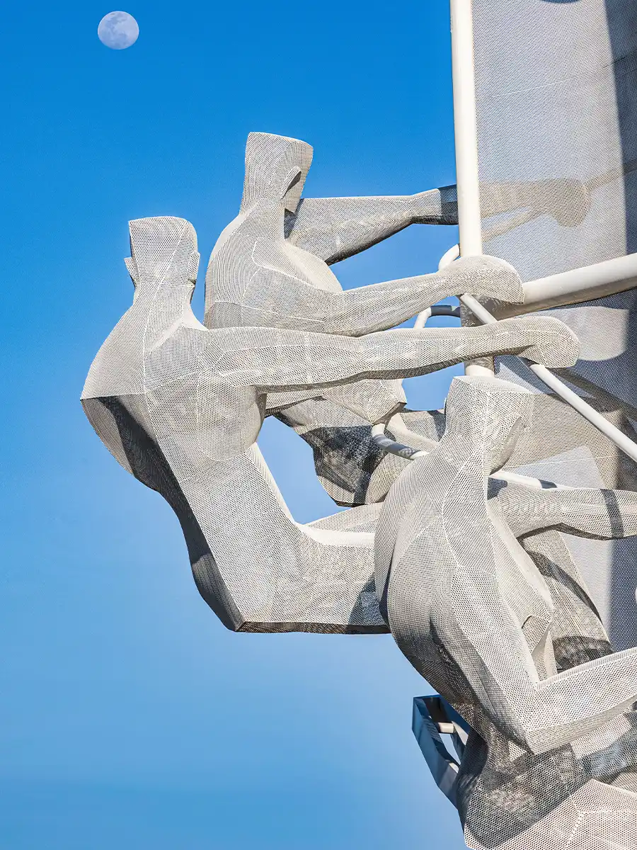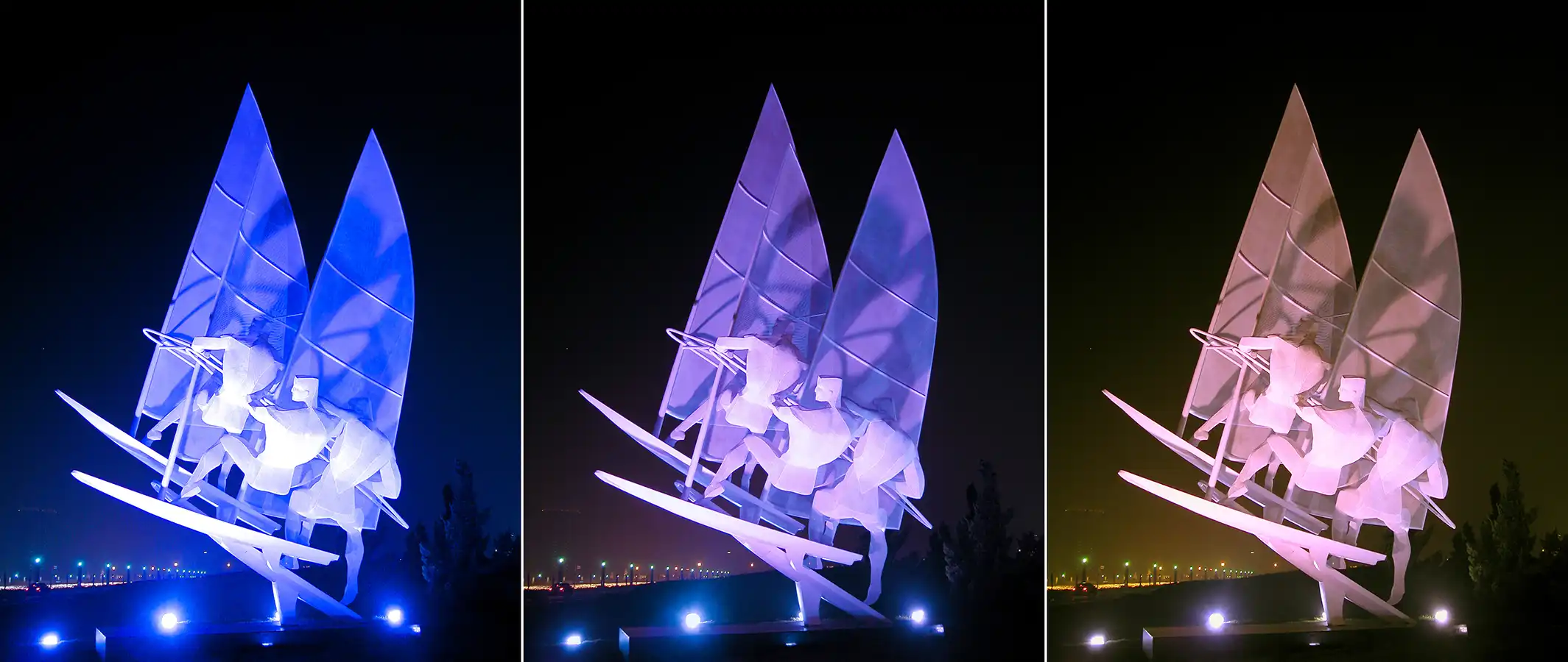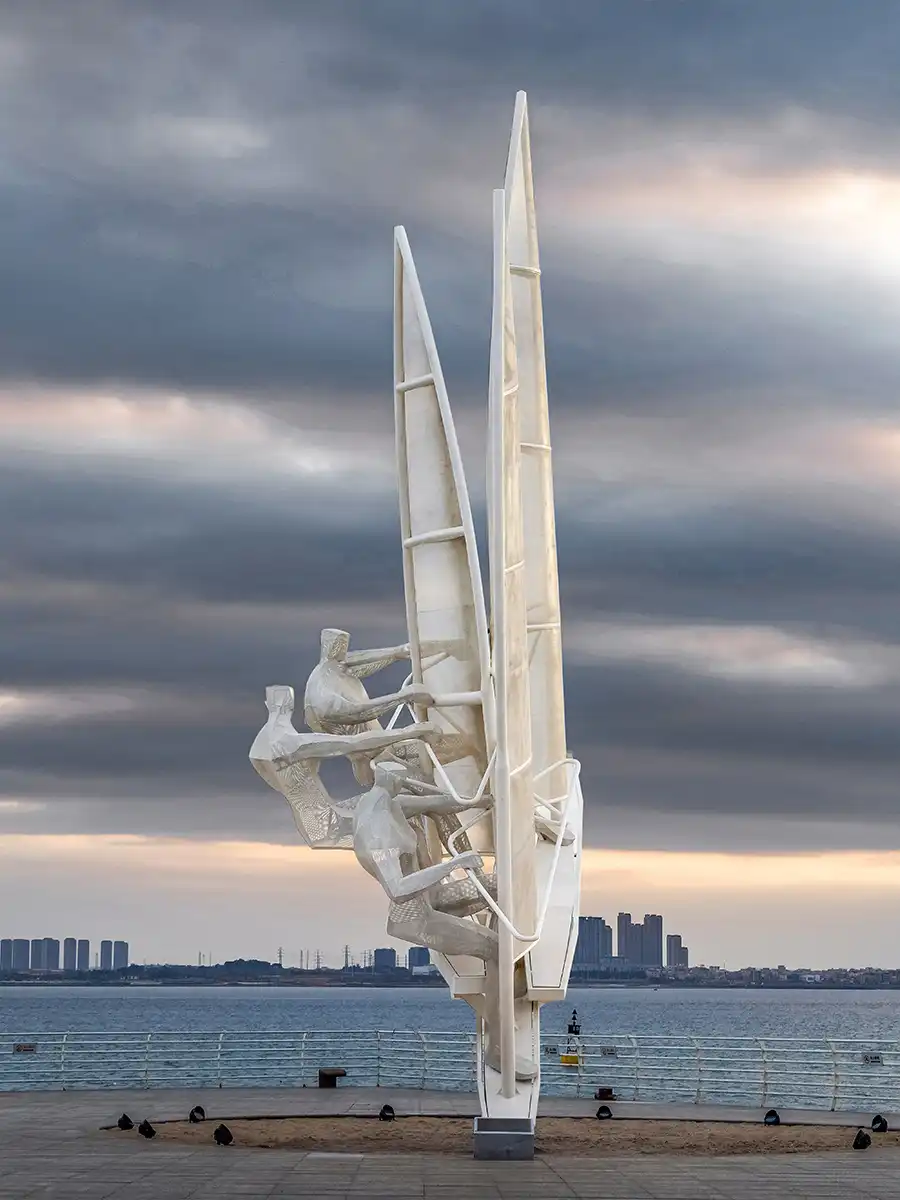 Set sail together; ride the wind and waves together to help each other. Dare to transcend; dreams shine ahead. Sailing also means smooth sailing, riding the wind and waves, and being fearless. The work symbolizes the firm direction and ideals of people from afar. The first step to success in life is to set sail. The work is made of stainless steel hollow board, which is not only windproof but also can achieve the colorful night scene effect under the projection of light.