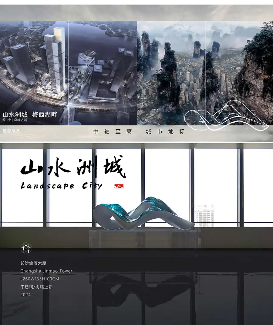 解构长沙骨血——岳麓为脊,湘江化脉,洲陆作韵,城廓成魂,淬炼为莫比乌斯曲面上的山水史诗。镜面不锈钢倒映城市天际线的生长轨迹,透明树脂晕染星城千年文脉的呼吸,二者交织成一座行走的时空棱镜。此作不摹山水形貌,而将长沙金茂大厦铸为城市进化的能量轴心,见证长沙以山河为卷轴,挥毫泼墨向未来