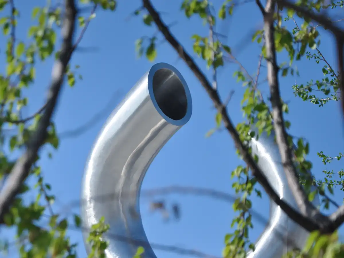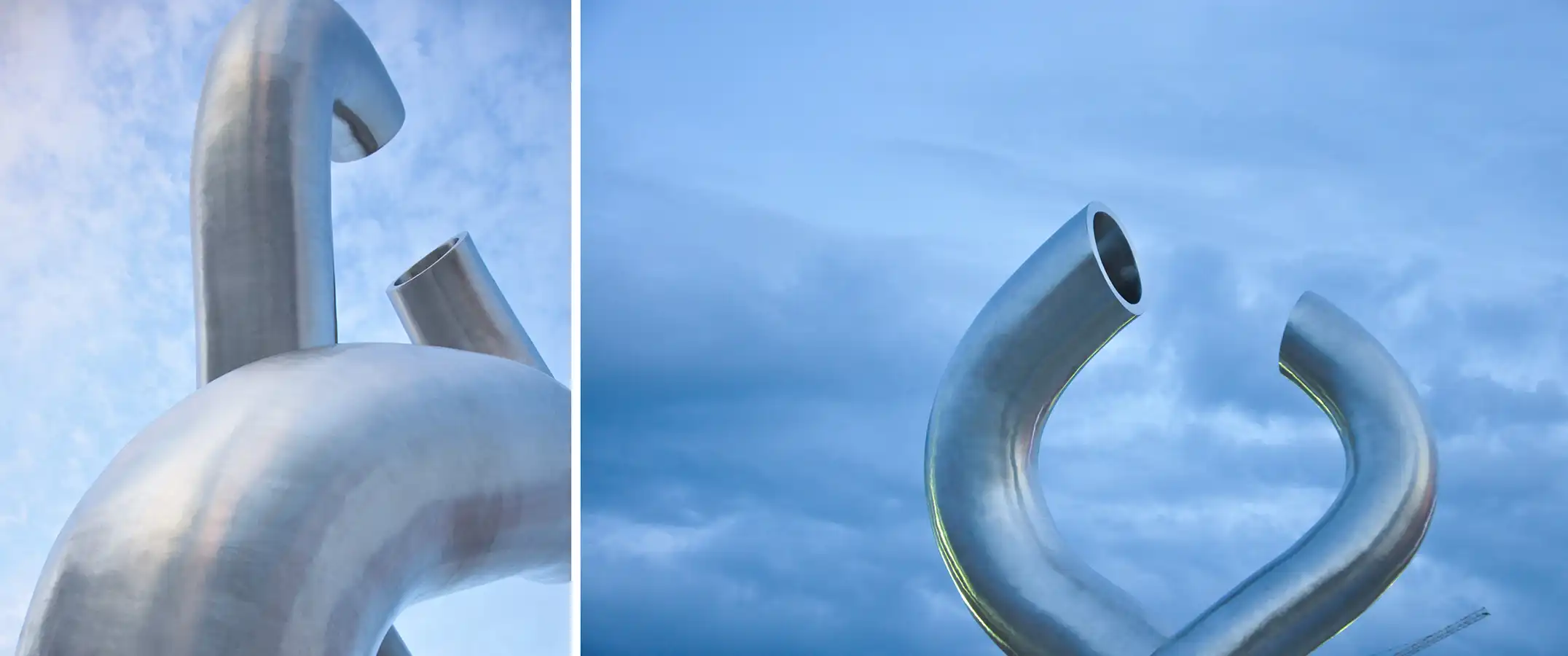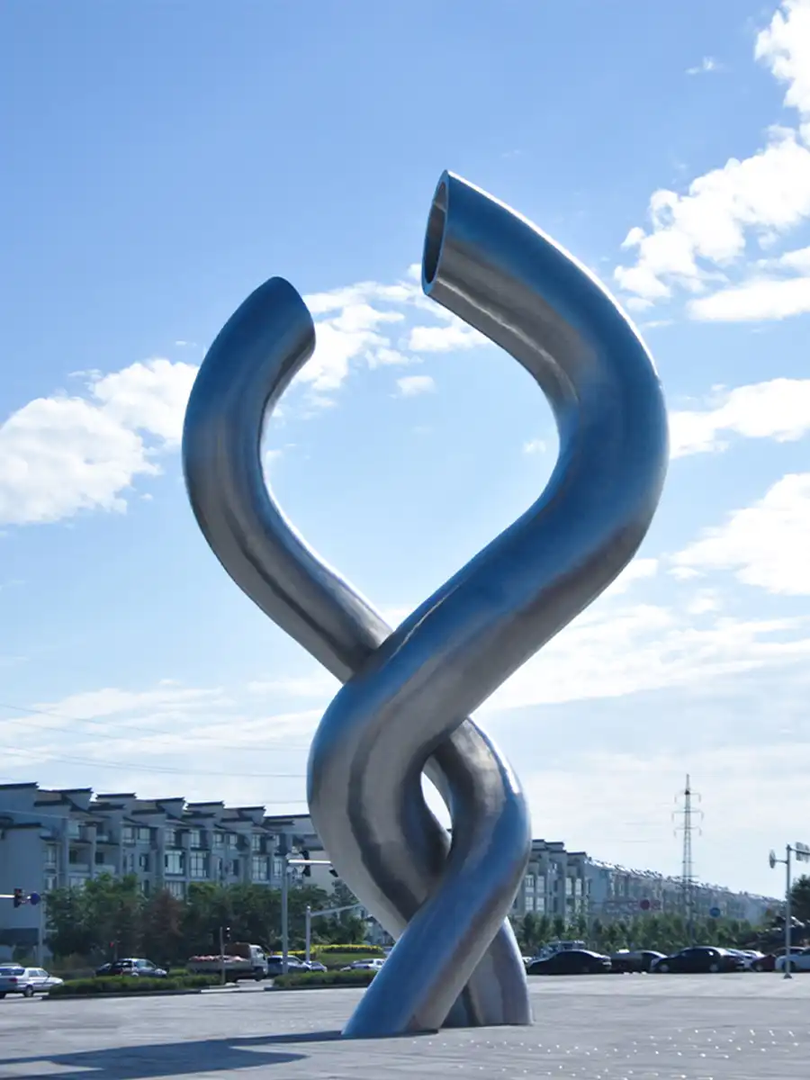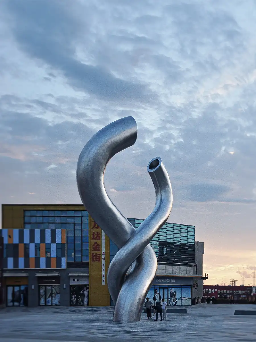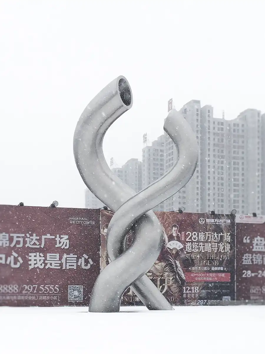 盘锦缘油而建,因油而兴,素有“油城”和“湿地之都”的美誉。本作品以油管的钢铁质感与柔情缠绵的表现相结合,造型设计灵感来源于著名摄影作品《胜利之吻》:1945年8月15日,世界各地民众纷纷走上街头庆祝二战胜利,纽约时代广场一位水兵在兴奋庆祝中与一位陌生女护士深情拥吻,受这一经典历史画面启发创作了本作品。