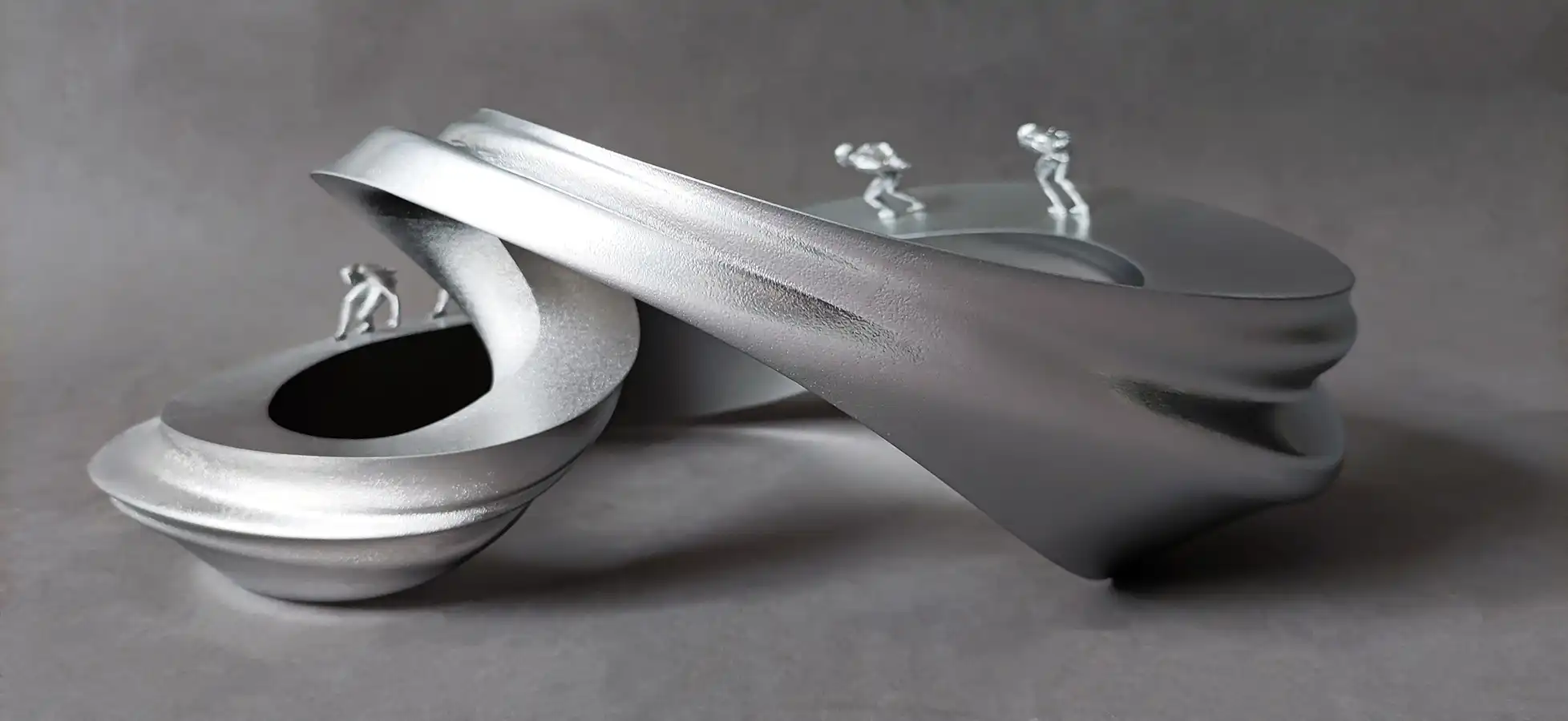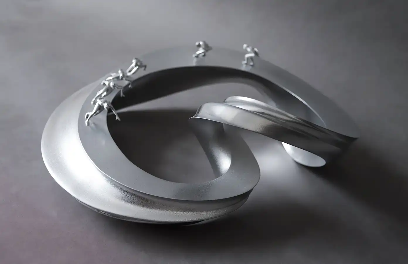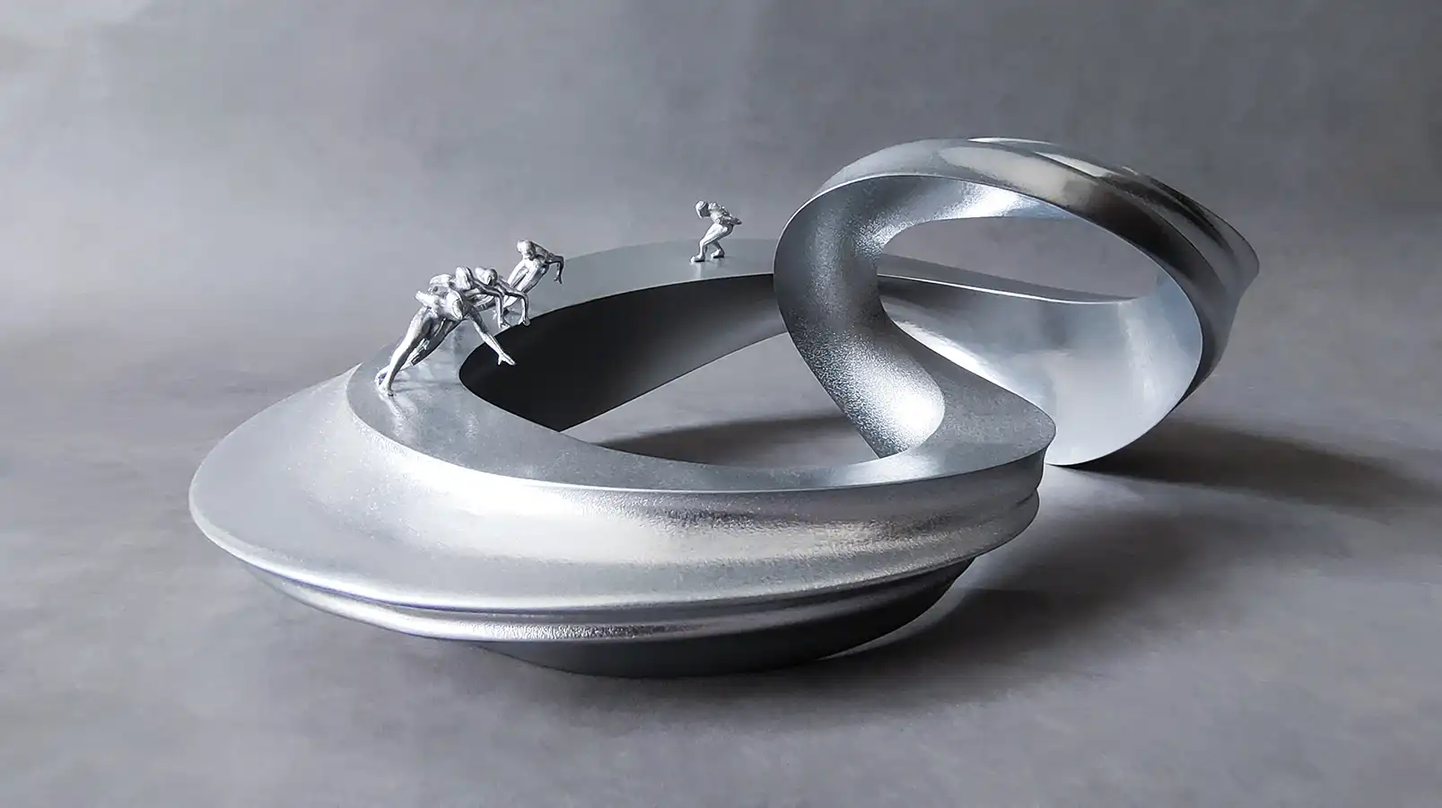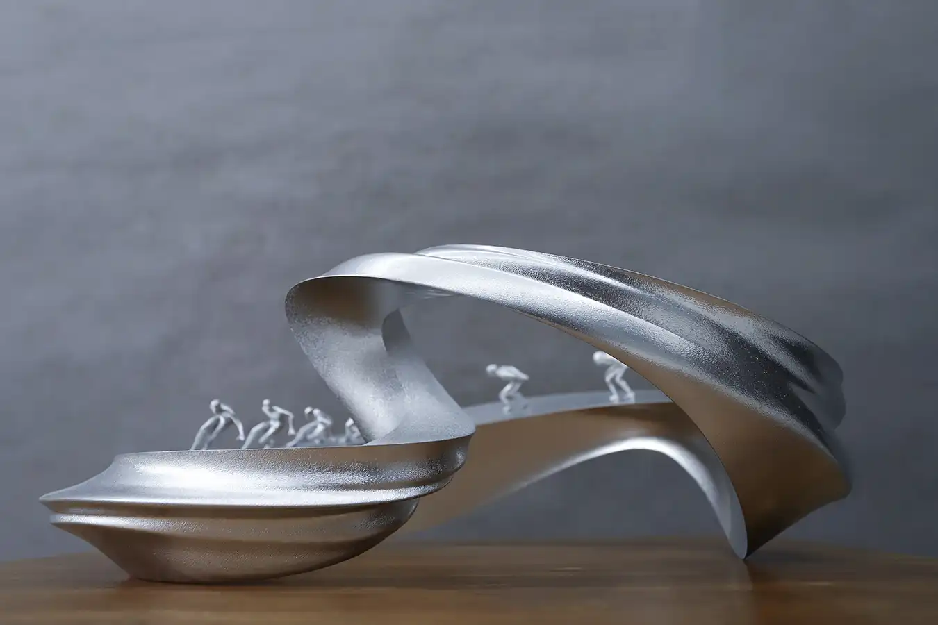 作品创作将速滑运动员与冰丝带融为一体,运动员如流星般轻盈飞驰,展现奥运精神的传承不息。